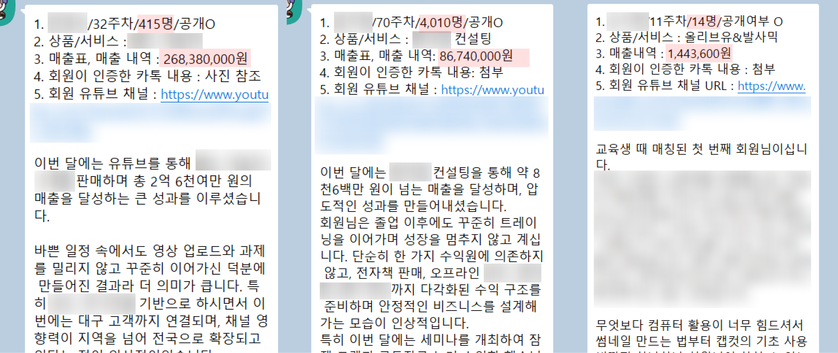 이 방식을 적용하자 올리브유를 파는 구독자 14명 채널에서도 140만원의 한달 매출이 발생했다. 오프라인 창업을 알려주는 구독자 4,010명 채널에서도 8,000만원의 한달 매출이 발생했다.
